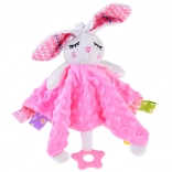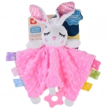 Roztomilá plyšová mazlivka ve tvaru králíčka s měkoučkou dekou, barevnými štítky a silikonovým kousátkem poskytuje miminku klid a jistotu. Podporuje smyslový rozvoj, nabízí různorodé textury, šustivé a pískací prvky a je ideální do postýlky, kočárku i autosedačky.