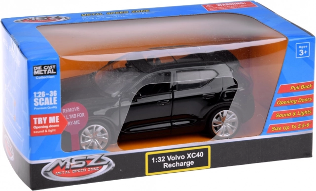 Detailní kovový model VOLVO XC40 RECHARGE v měřítku 1:32 potěší sběratele i děti. Nabízí otevírací dveře, realistické světelné a zvukové efekty a pohyb na zpětný setrvačník (friction power). Kovová karoserie, gumová kola a precizní zpracování zaručují odolnost i skvělý vzhled.