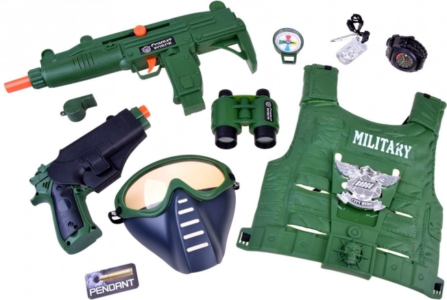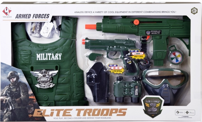 Tato kompletní vojenská výbava potěší každého malého dobrodruha. Díky lehké taktické vestě a široké škále doplňků si děti snadno zahrají na průzkumníky, strážce i hrdiny. Zbraně se zvukovými efekty a odnímatelná maska dodají hře na autentičnosti, zatímco kompas a lornetka podpoří představivost a orientaci v terénu.