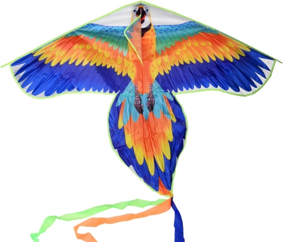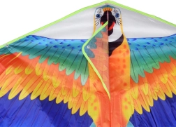 Tento velký drak ve tvaru papouška ary je skvělou volbou pro rodinné výlety do parku, na pláž i louku. Lehká konstrukce se díky větru rychle zvedne a let je stabilní díky dlouhému ocasu se stuhami, které zlepšují rovnováhu ve vzduchu.