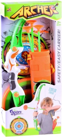 Zábavná a bezpečná lukostřelecká sada pro děti obsahuje luk, závěsný terč, 3 šípy s přísavkami a toulec. Díky měkkým přísavkám je hraní bezpečné i v interiéru, pestrá barevnost a snadné použití podpoří přesnost, koordinaci a trpělivost.