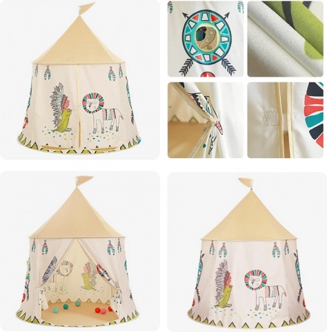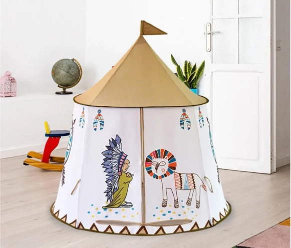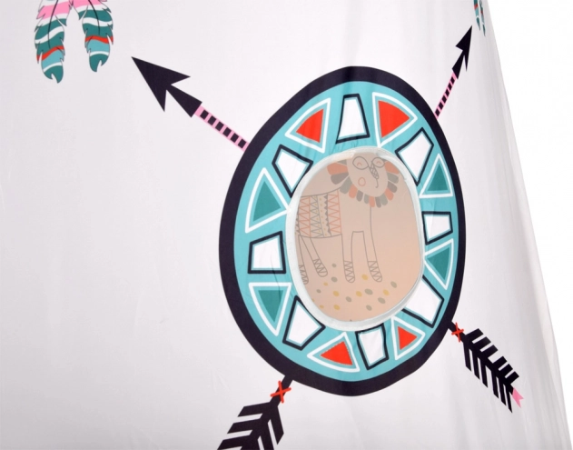 Toto kulaté tipi s hravými indiánskými potisky promění pokoj v kouzelný koutek pro čtení, hraní rolí i odpočinek. Lehká konstrukce zajišťuje snadný montáž/demontáž a přesun dle potřeby, zatímco prodyšná textilie poskytne příjemné klima při hře.