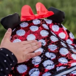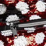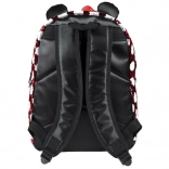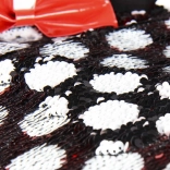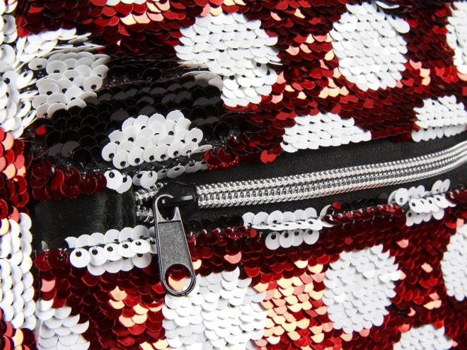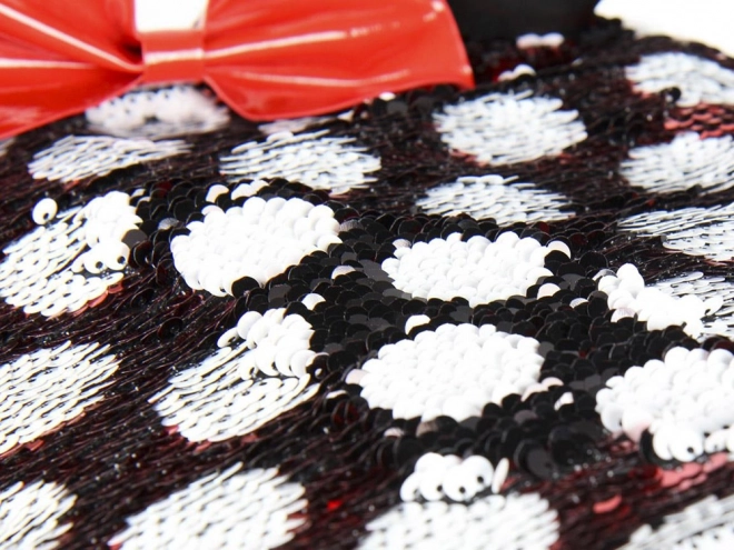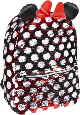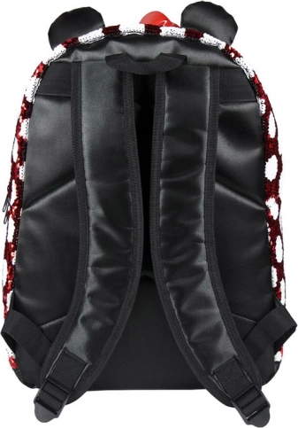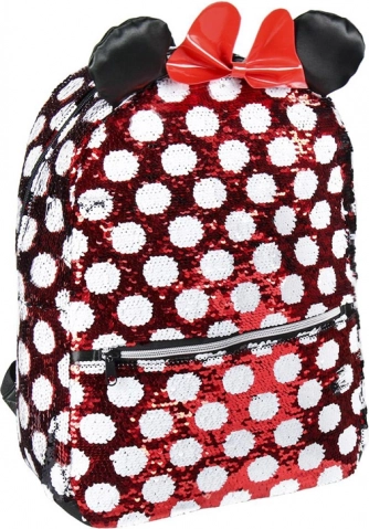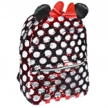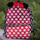 Batoh s charakteristickým vzorem Minnie v červené a bílé kombinaci s polka dots, ozdobený červenou mašlí a třpytivými ušima, je skutečně kouzelný.