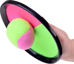 Rozdělená chytací plocha v neonové zelené a růžové barvě se suchým zipem zachytí míček okamžitě – ideální pro trénink přesnosti a reflexů.