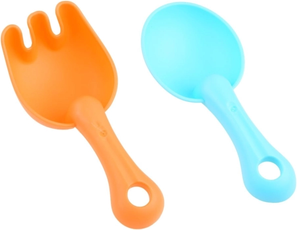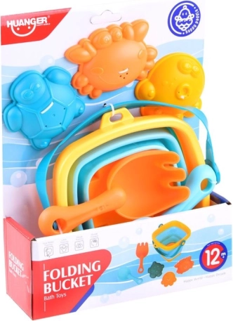 Obsahuje vše, co děti potřebují pro kreativní hru v písku: skládací kbelík, lopatku, hrábě a tři formičky.