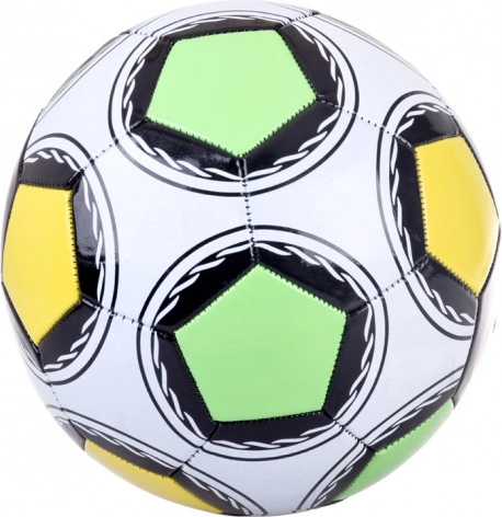 Pestrý fotbalový míč velikosti 9 palců (22,86 cm) je navržen pro zábavu na venkovních i vnitřních hřištích. Je vyroben ze syntetické kůže s lesklou povrchovou úpravou a strojovým šitím.