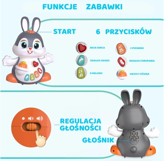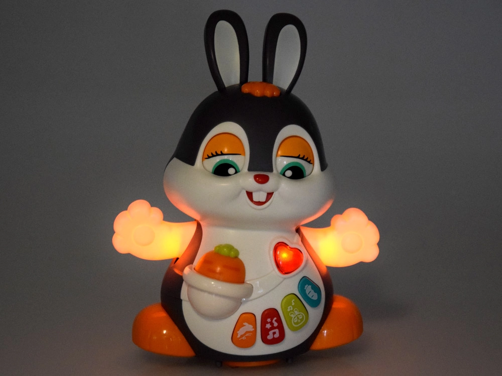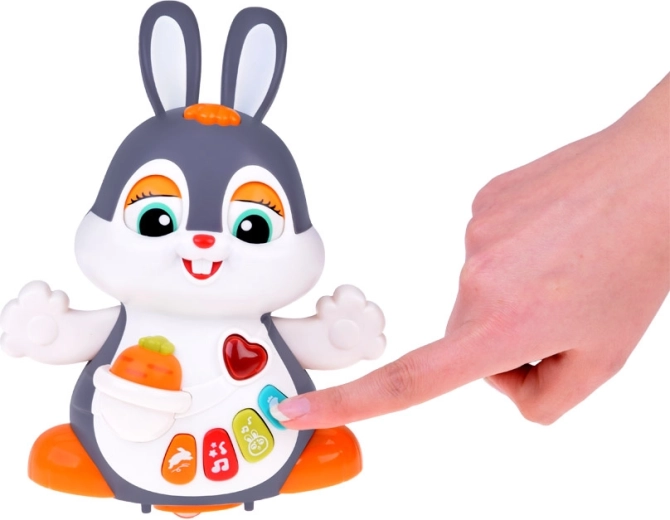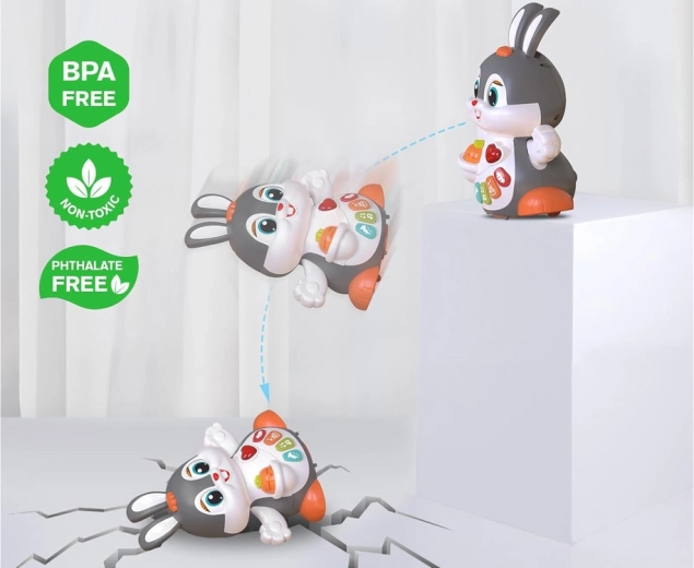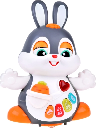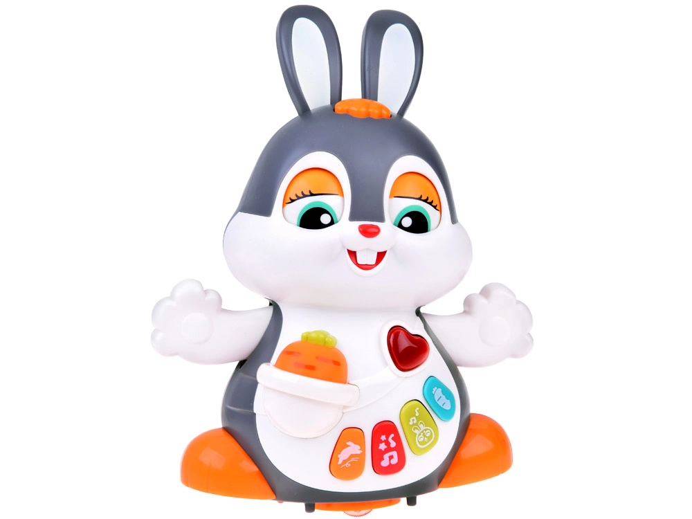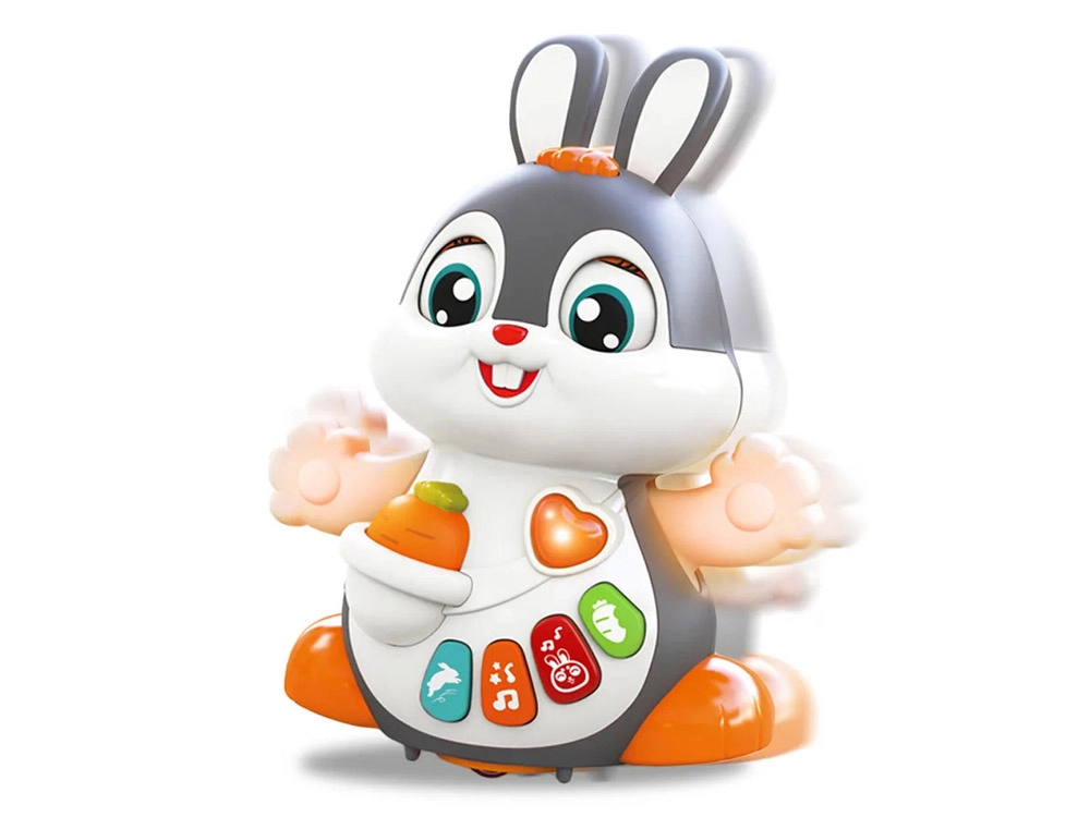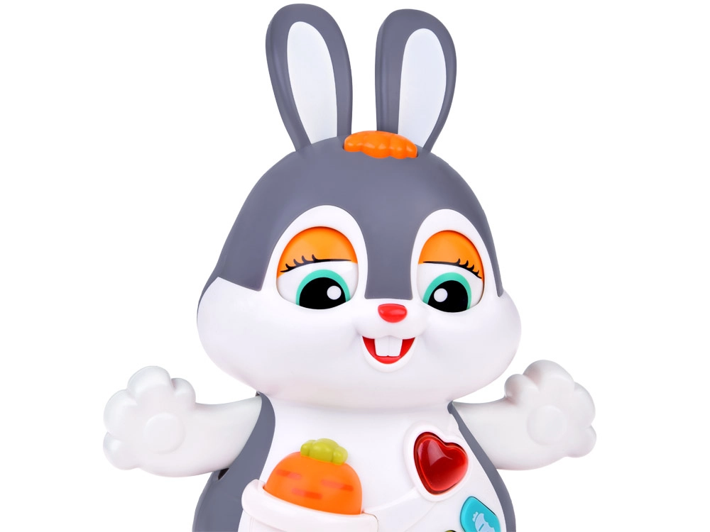 Roztomilý interaktivní králíček motivuje děti k pohybu a učení. Po stisknutí tlačítek se rozsvítí, přehraje melodie a vydává zvuky. Díky funkcím jako světelné efekty, veselé melodie, pohyblivé uši a tlapky a mrkající oči je ideální pro rozvoj smyslů a jemné motoriky.