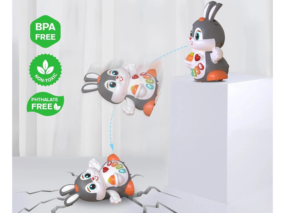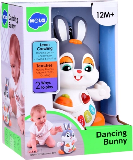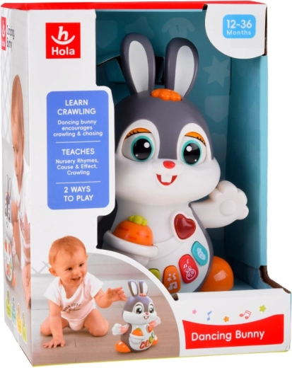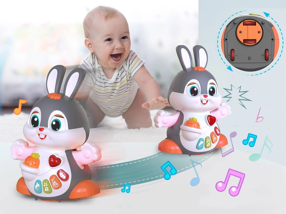 Interaktivní tancující králíček je skvělým společníkem pro první krůčky a lezení. Hračka se umí pohybovat, mrká očima a v rytmu hudby svítí. Děti zaujmou barevná tlačítka s různými funkcemi: melodie, tlukot srdce, zvuky skákání či kousání mrkvičky – vše doprovázené světelnými efekty.