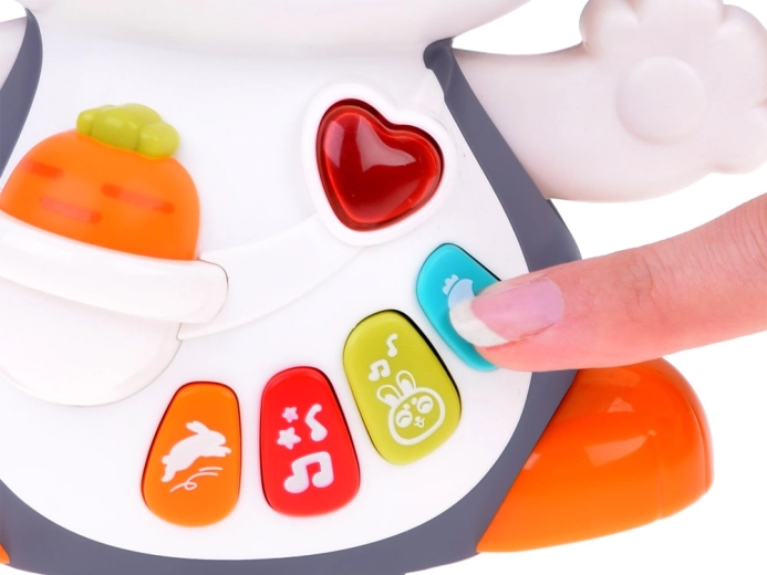 Barevná tlačítka spouštějí různé melodie a zvuky (tlukot srdce, skákání, kousání mrkvičky), které doprovází blikající světýlka – ideální pro smyslovou stimulaci.