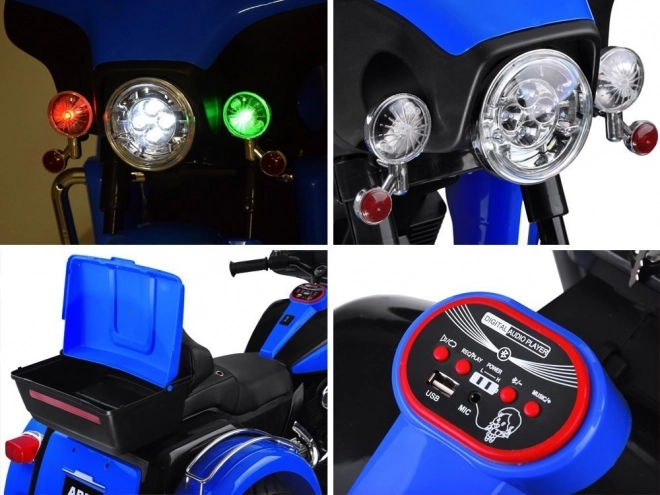 Stylová dětská elektrická motorka typu chopper nabídne malým jezdcům pohodlnou a bezpečnou jízdu po chodnících i v parku. Má silný dvojitý pohon 2 × 12 V, světla vpředu i vzadu, uzamykatelný zadní kufr na drobnosti a hudební panel s USB/MP3 pro oblíbené písničky. O komfort se stará měkce čalouněné sedlo a široké stupačky, o jistotu pak elektrická brzda po uvolnění pedálu a kola EVA s tichým chodem.