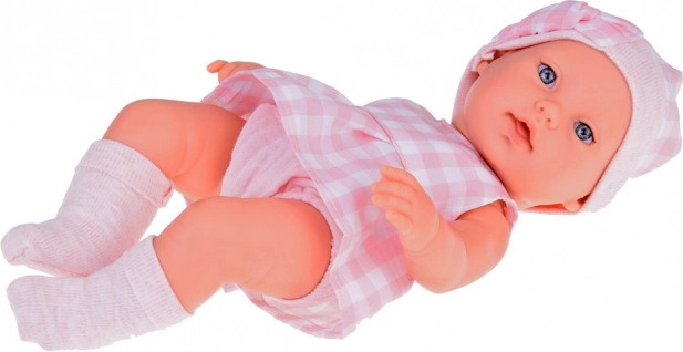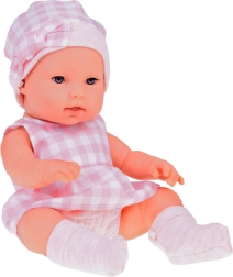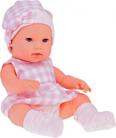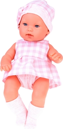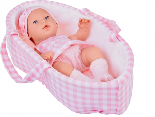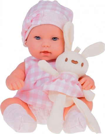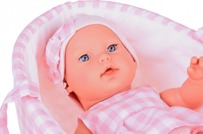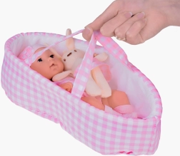Roztomilá panenka novorozeně v růžovém kostkovaném oblečku je ideální pro kreativní hru a rozvoj fantazie. Součástí je měkký košík na přenášení a plyšový králíček sladěný s outfitem panenky. Panenka má realistické rysy, pohyblivé končetiny a je vyrobena z odolného plastu, který se snadno udržuje v čistotě.
