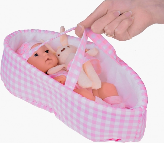 Tato realistická panenka novorozeně je skvělou společnicí pro malé pečovatelky. Je oblečená do jemně růžového kostkovaného oblečku s čepičkou a ponožkami. Set je barevně sladěný – plyšový králíček i měkký košík ladí s outfitem panenky, což z něj dělá krásný a kompletní dárek.