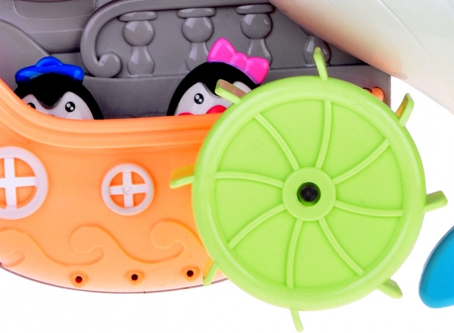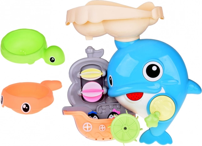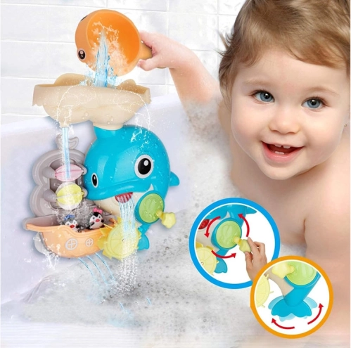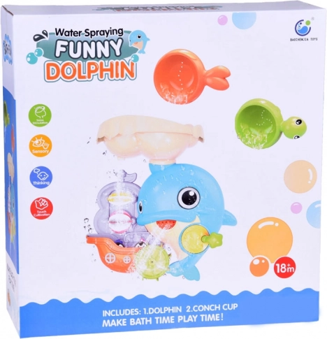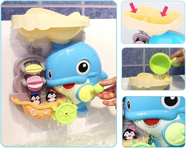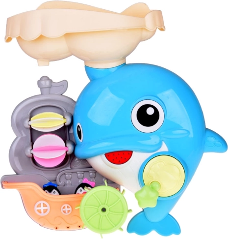 Veselý delfín do vany je barevná interaktivní hračka, která děti láká k objevování vodních experimentů. Stačí nalít vodu do horní nádržky a sledovat, jak se roztočí vodní kolečka, spustí se vodopád a pohne se ploutev delfína. Loďka s malými tučňáky doplňuje příběhy při koupání.