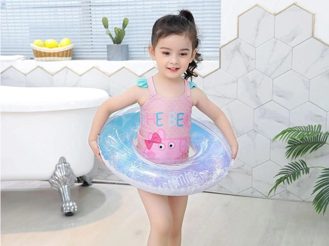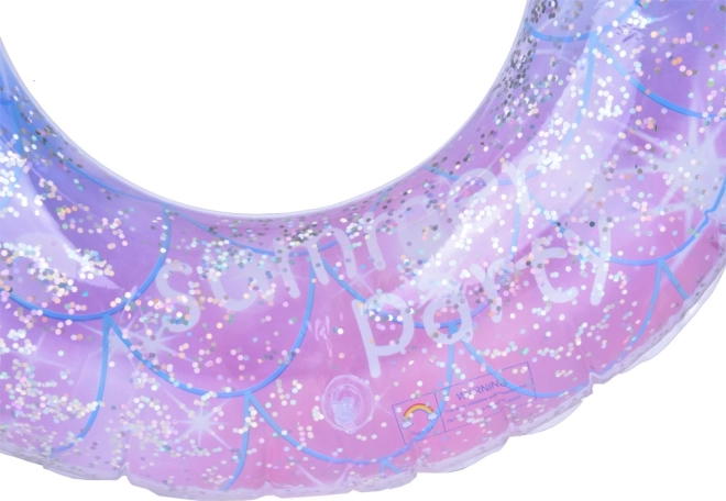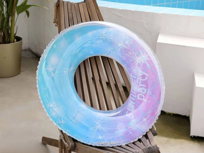 Průhledný kruh s modro‑růžovým gradientem a třpytkami „summer party“ zazáří u bazénu i na pláži a potěší každé dítě.