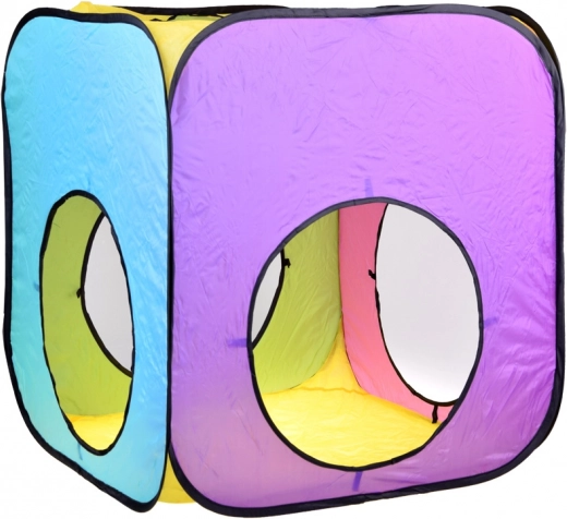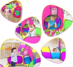 Každý stan nabízí jiné aktivity: trojúhelníkový stan s terčem a otvory pro trefování míčky na suchý zip, čtvercový stan se dvěma vchody a možností napojení tunelů a stan – bazének/kojec ideální pro suchý bazén s míčky (míčky nejsou součástí balení). Barevné panely a síťované části podporují vizuální stimulaci a dozor dospělých.