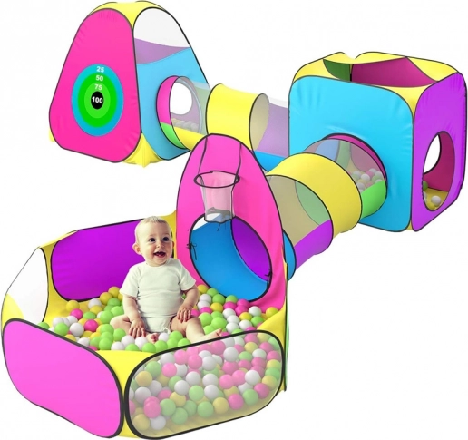 Vytvořte dětem vlastní herní svět s tímto univerzálním setem stanů a tunelů 5v1. Kombinujte až pět prvků do různých sestav pro hodiny kreativní, pohybové a smyslové zábavy. Set je skládací, lehce přenosný a vhodný pro hraní doma i na zahradě. Nechybí cílový terč pro házení míčků na suchý zip, bazének/kojenecký ohrádkový stan na míčky a snadné propojení pomocí tunelů.