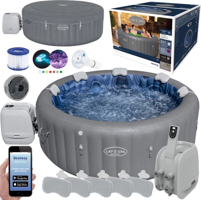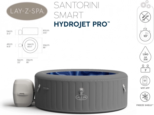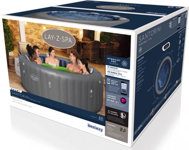 Model Santorini má vestavěnou Wi-Fi, takže uživatelé mohou lázně ovládat pomocí aplikace Bestway Smart Hub™. Pro ještě větší pohodlí aplikace umožňuje uživatelům měnit teplotu vody, aktivovat časovač úspory energie, filtrovat vodu a dokonce spustit masážní systém!