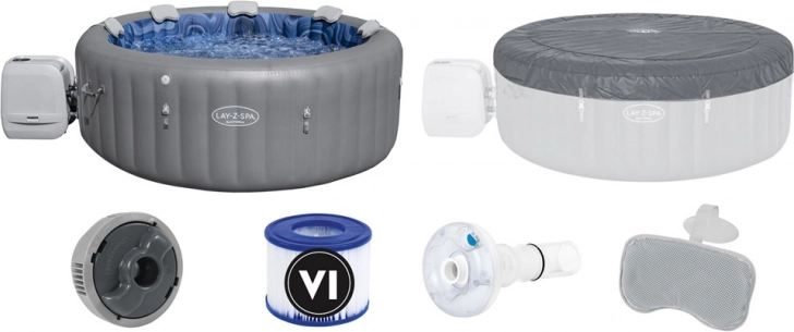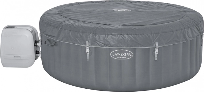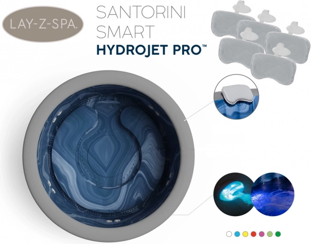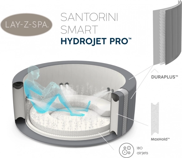 Bestway Lay-Z-Spa Santorini™ je nafukovací přenosná vířivka, ideální pro ty, kteří ocení luxusní relaxaci při zachování soukromí. Dobře poslouží pro pohodlný odpočinek po vyčerpávajícím dni, pro setkání s přáteli nebo romantický večer jen ve dvou. Tisíce masážních bublinek, správná teplota vody a efektní osvětlení uvolní a zrelaxují vaše tělo a umožní vám odpočinek. Nafukovací sedátko a 5 polstrovaných hlavových polštářů poskytují další pohodlí.