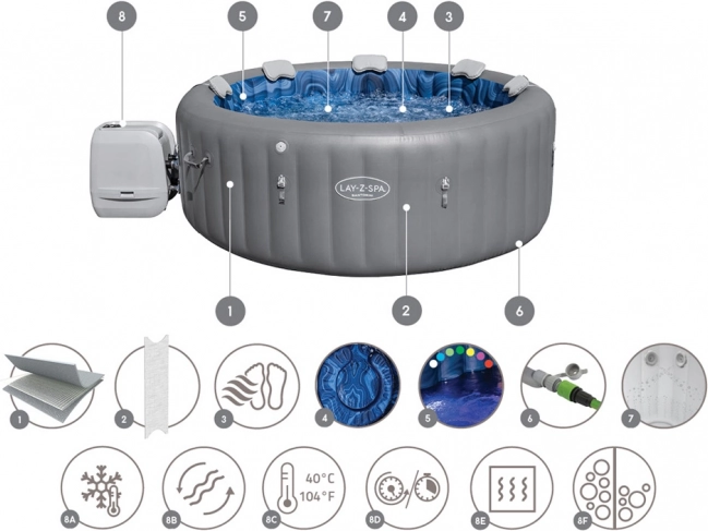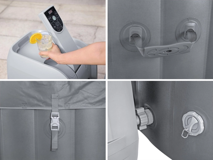 Nafukovací stěny této lázně jsou vyrobeny z odolného třívrstvého materiálu DuraPlus™, který je odolný proti propíchnutí. Vyznačuje se vyšší odolností proti roztržení a pevností v tahu (ve srovnání s běžným PVC). Tento typ vnitřní konstrukce zabraňuje rozpínání v průběhu času, takže lázně si zachovávají stejný tvar bez ohledu na to, kolikrát jsou nafouknuty a vyfouknuty.