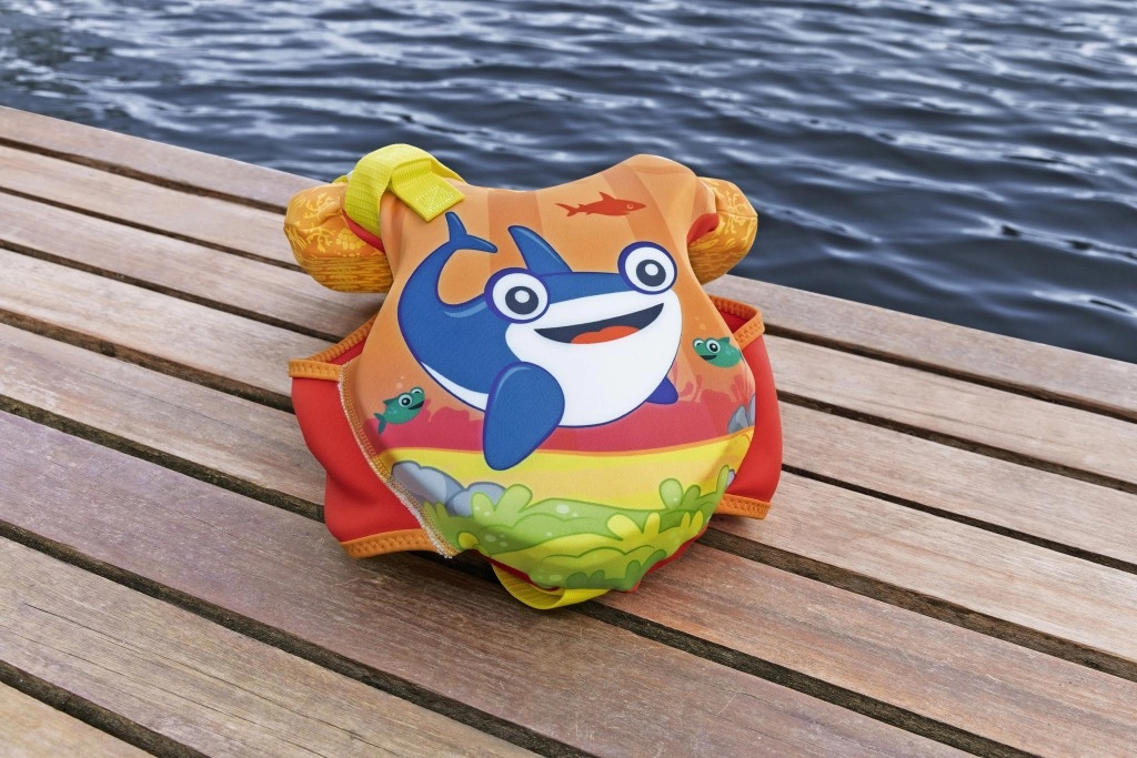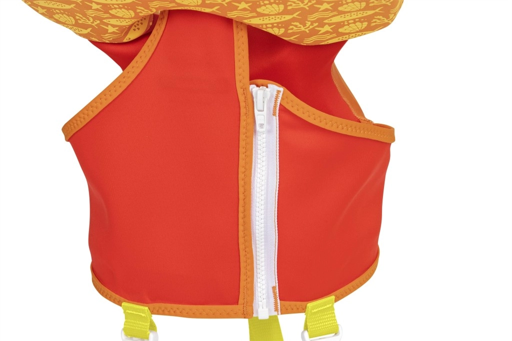 - Skvělá viditelnost: jasné oranžovo‑žluté barvy a veselé mořské motivy