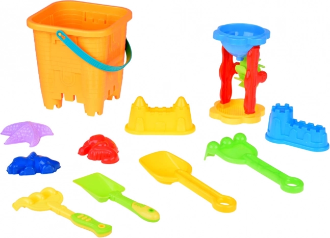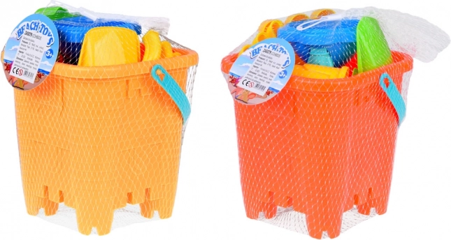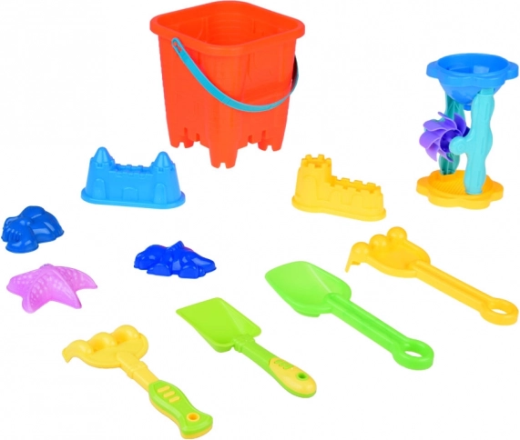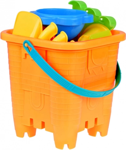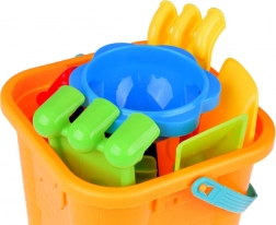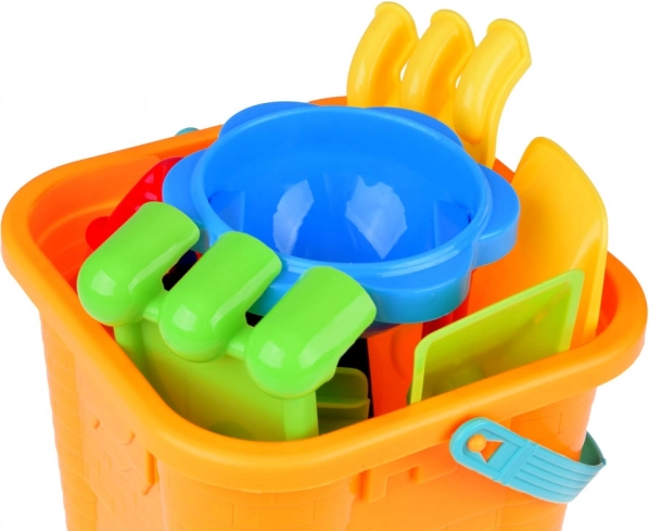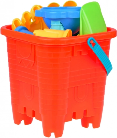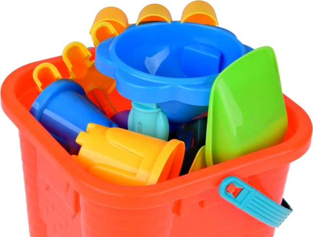 Barevná sada na písek pro malé stavitele přináší vše, co je potřeba k tvorbě hradů, věží a mořských tvarů. Obsahuje vědro ve tvaru zámku, dvě lopatky, dvě hrábě, pět formiček a vodní/sypký mlýnek. Díky pohodlné silikonové rukojeti se vědro dětem dobře nosí a vše lze po hře snadno uklidit. Ideální na pláž, hřiště i do vany – pro kreativní hru, rozvoj jemné motoriky a fantazii.
