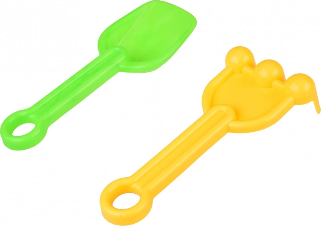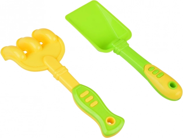 - Kompletní výbava: 2 lopatky, 2 hrábě, 5 formiček (2× hrad, rozeta/rozeta hvězdice, dinosaurus, mořský koník) a mlýnek.