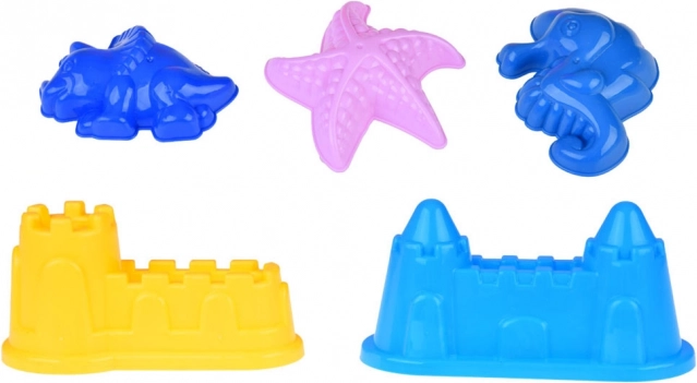 Pět formiček (hrady, hvězdice, dinosaurus, mořský koník) a sada lopatek a hrábí umožní tvořit rozmanité stavby i detaily.