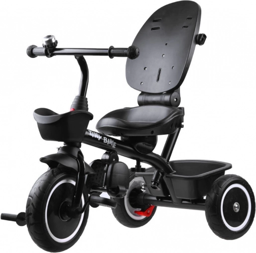 Rodiče ocení nastavitelnou vodicí tyč s pohodlným úchopem, dvojité parkovací brzdy na zadních kolech a praktické úložné prostory: přední košíček, zadní velký koš i malou tašku na drobnosti. Kola z EVA pěny nevyžadují huštění a poskytují tichou a stabilní jízdu. Sklopné stupačky a pedály na předním kole usnadní přechod mezi režimy, takže tříkolka plynule roste s dítětem.