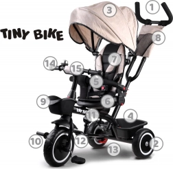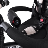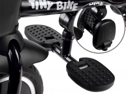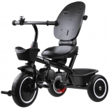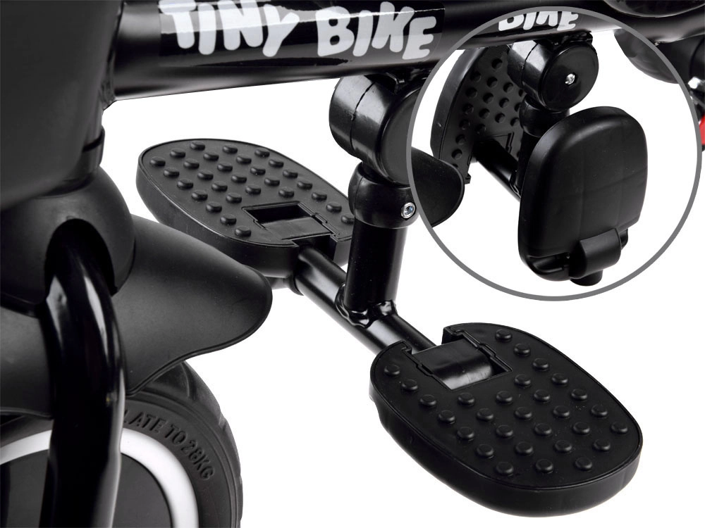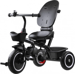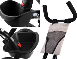 Rodiče ocení nastavitelnou vodicí tyč s pohodlným úchopem, dvojité parkovací brzdy na zadních kolech a praktické úložné prostory: přední košíček, zadní velký koš i malou tašku na drobnosti. Kola z EVA pěny nevyžadují huštění a poskytují tichou a stabilní jízdu. Sklopné stupačky a pedály na předním kole usnadní přechod mezi režimy, takže tříkolka plynule roste s dítětem.