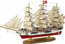 Tento sběratelský model plachetnice DANMARK věrně zachycuje atmosféru klasických školních a výcvikových lodí. Na dřevěné základně je umístěn název lodi, nechybí dánská vlajka na stěžni a realistické detaily paluby včetně záchranných člunů, světel a klaksonů. Kontrastní bílé plachty s černým vzorem a červeno‑bílý trup se zeleným pruhem dodávají modelu výrazný námořní charakter.