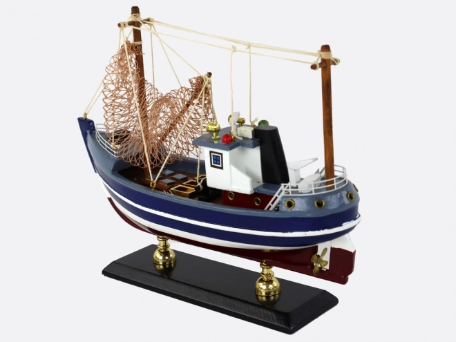 Tento pečlivě zpracovaný dřevěný model představuje klasický rybářský kutr na stabilních dřevěných nožkách. Kombinace tmavě modré a bílých pruhů podtrhuje tradiční námořní styl, zatímco precizně vyvedené detaily dodávají realistický vzhled.