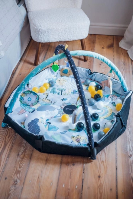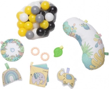 Podložka je oboustranná – světlá „denní“ a tmavší „noční“ strana – pro vizuální stimulaci i snadné stylové sladění s interiérem. Součástí je zrcátko, kousátko, šustící knížka a měkoučký polštářek ve tvaru croissantu pro pohodlné pasení koníčků. 30 míčků v samostatné síťce promění hrací plochu v zábavný suchý bazének.