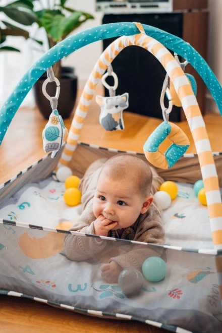 Čtyři různé hračky se zvukovými a hmatovými prvky a sada pastelových míčků rozvíjejí jemnou i hrubou motoriku.