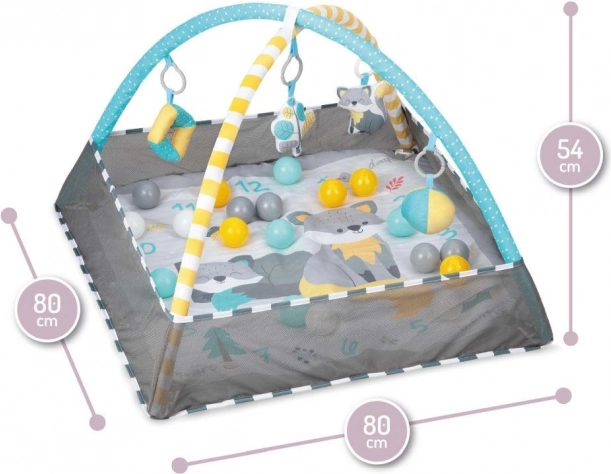 Deka funguje jako 4v1: podložka pro první přetáčení, ohrádka se síťkou, bazének s míčky pro zábavu a fotopodložka pro zaznamenávání milníků. Termoizolační vrstva udržuje příjemné teplo a pohodlí, 4 různé hračky (šustící a pískací prvky) trénují jemnou i hrubou motoriku a soustředění.