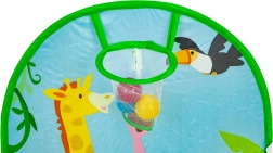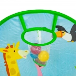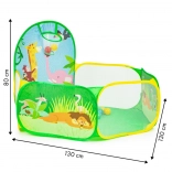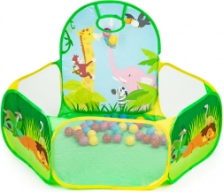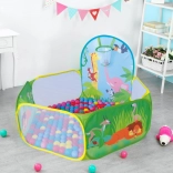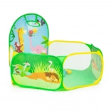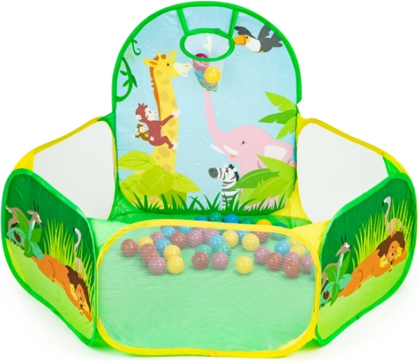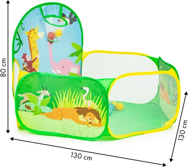 Součástí balení je 50 plastových míčků (Ø 6 cm), které promění stan v zábavný suchý bazének. Vestavěný koš na házení motivuje k pohybu, rozvíjí koordinaci a přesnost. Odolná podlážka je připravena na hraní uvnitř i venku.