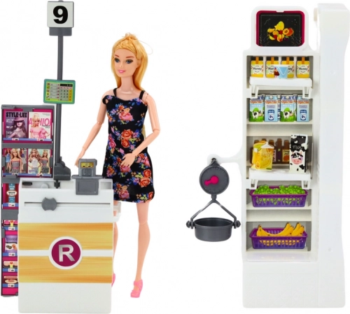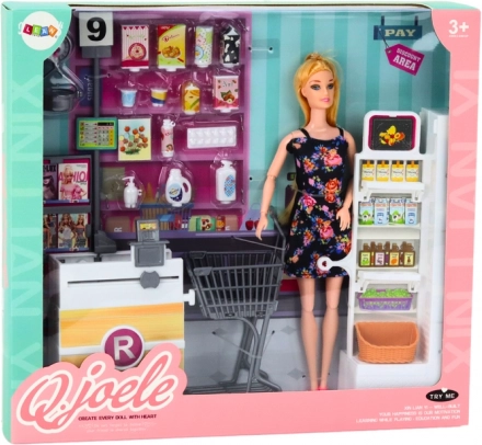Tento zábavný a edukativní set přenese děti do světa nákupů. Panenka v roztomilém oblečku, obchodní regál, nákupní košík, pokladna a drobné potraviny umožňují přehrávat různé situace – od výběru zboží až po placení u pokladny. Díky pohyblivým končetinám a zápěstím může panenka snadno „uchopit“ zboží a vkládat ho do košíku.