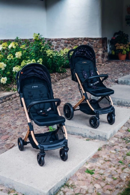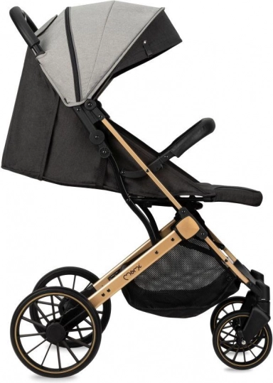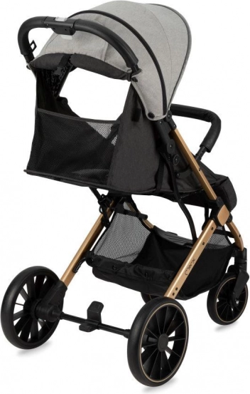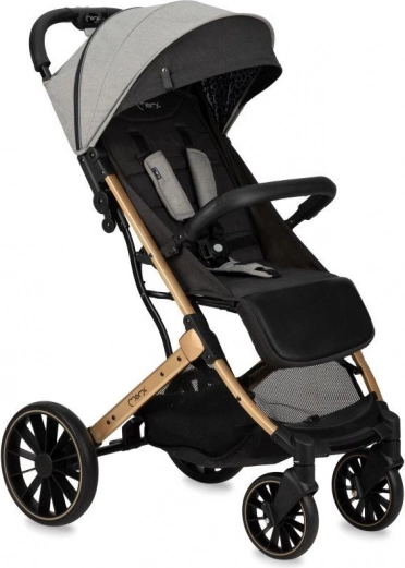 Děťátku dopřejete pohodlí díky plynule nastavitelné opěrce zad do lehu, polohovatelné opěrce nohou s potahem z ekokůže a rozšiřitelné stříšce se dvěma okénky a UV ochranou. Pětibodové pásy a odnímatelné madlo se postarají o bezpečí. Praktický koš unese až 2 kg vašich nezbytností.