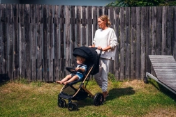 Po složení má kočárek malé rozměry a díky speciálnímu madlu ho snadno povedete za sebou – ideální do města i na cestování.