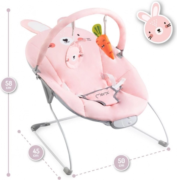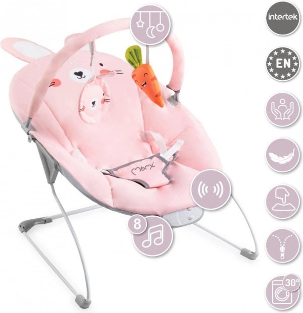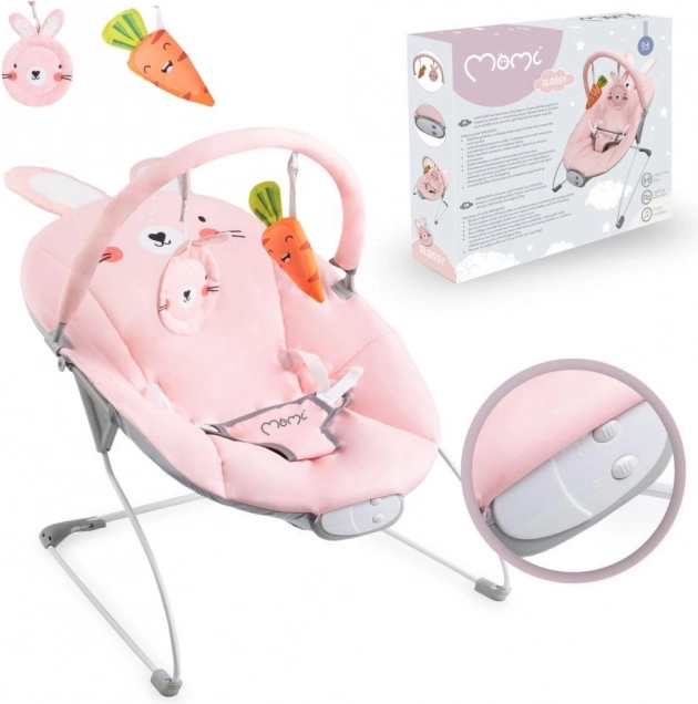 MoMi Glossy je praktické vibrační lehátko navržené pro nejmenší od narození do 6 měsíců. Díky kompaktní a lehké konstrukci ho snadno přenesete i složíte, a tak ho využijete doma i na návštěvě. Roztomilý design růžového králíčka potěší děti, zatímco rodiče ocení stabilitu a snadnou údržbu.