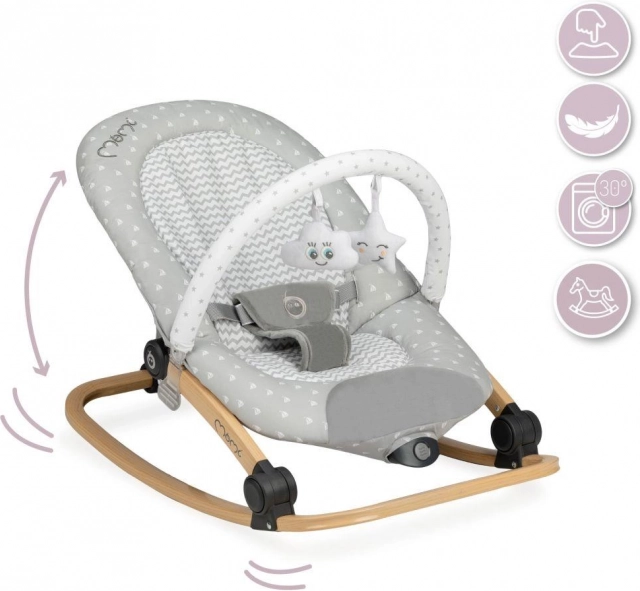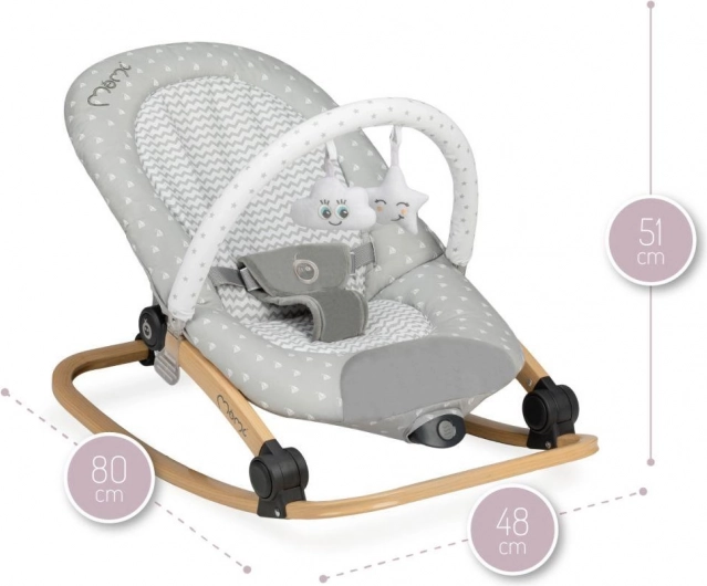 Lehátko MoMi Lumiwood poskytuje ideální zázemí pro odpočinek vašeho dítěte. Díky tříbodovému bezpečnostnímu pásu a speciálnímu rozkrokovému pásu je vaše dítě vždy v bezpečí. Lehátko je vybaveno senzorickou jednotkou, která generuje melodie a vibrace.