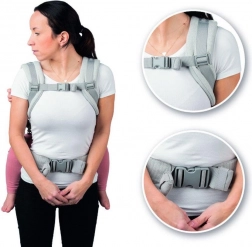 Široký bederní pás, měkké ramenní popruhy a kryté přezky rozkládají váhu a zvyšují komfort i při delším nošení. Odnímatelná kapuce chrání hlavičku dítěte.