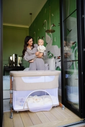 Robustní hliníkový rám s kolečky pro snadnou manipulaci, měkká vnitřní úprava a stabilní konstrukce dávají jistotu každý den i noc. Postýlka funguje jako 3v1: samostatná dětská postýlka, přistýlka k posteli rodičů a cestovní postýlka. Pod lůžkem je uzavíratelná přihrádka na potřeby (pleny, dudlík, deka), abyste měli vše po ruce.