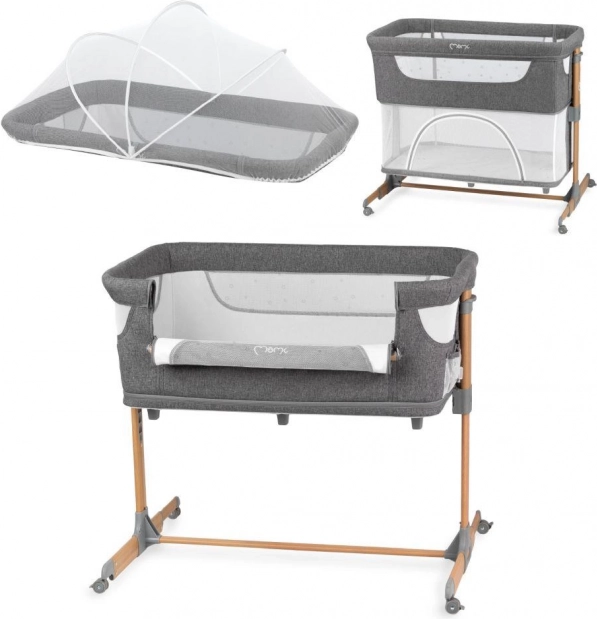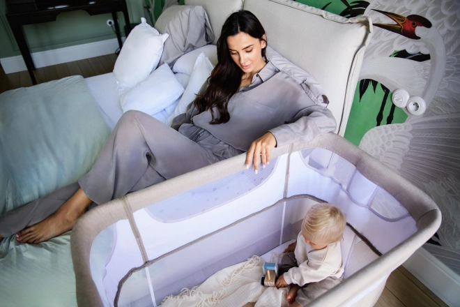 Síťované bočnice zajišťují skvělou cirkulaci vzduchu a přehled o děťátku. Součástí jsou dlouhé pásy pro pevné a bezpečné připojení k posteli rodičů.