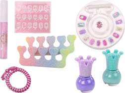 Paletka tipů, 2 separátory, gumička do vlasů, samolepky, 2 laky, pilníček a lesk na rty – kompletní mini salon v jediném balení.