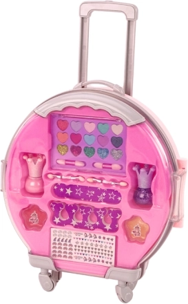 Tento růžový kosmetický set pro děti přichází v roztomilém kufříku na kolečkách s výsuvnou rukojetí, takže si jej malí vizážisté mohou vzít kamkoli. Uvnitř čeká bohatá výbava: paletka 15 odstínů očních stínů (8 jemně třpytivých, 2 matné, 5 výrazně lesklých), 2 laky na nehty (třpytivá fialová a klasická růžová), 2 lesky na rty, nálepky na nehty a praktické nástroje.