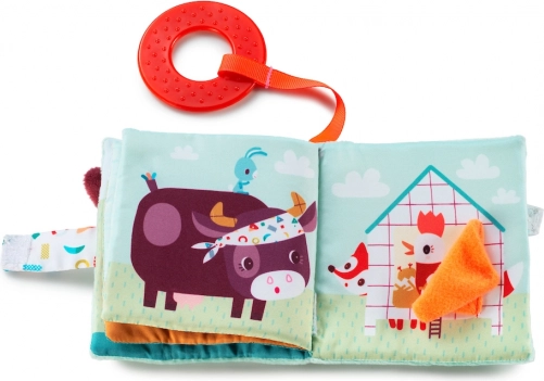 Pobavte ty nejmenší krásnou textilní knížkou s ilustracemi z prostředí farmy. Hodí se pro děti od 6 měsíců. Vtipné kresby a jiné aktivity zaujmou a pobaví každé batole. Knížka má poutko na suchý zip, díky kterému můžete knížku snadno zavěsit na kočárek nebo na postýlku. Rozměr knížky je 9,5 x 10,5 x 2,5 cm. Knížka stimuluje zrak, sluch a děti najdou i všité kousátko. Kousátko dětem uleví při prořezávání prvních zoubků. Knížka neobsahuje text, ale veselé ilustrace hospodářských zvířat poskytují prostor pro vyprávění jednoduchých příběhů. Zatímco maminka vypráví, mohou děti objevovat zvuky a textury.