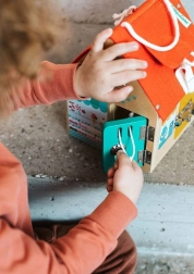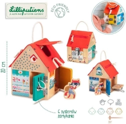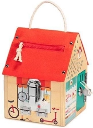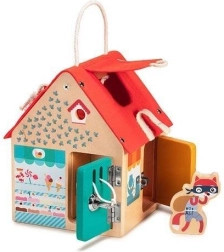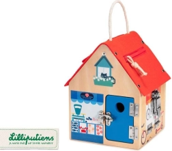 Tento kvalitně zpracovaný domeček z dílny belgické značky LILLIPUTIENS nabízí na každé straně i na střeše jinou aktivitu. Děti budou otevírat a zavírat dvířka do různých "obchůdků" (cyklo, cukrárna, klenotnictví, potraviny) a zkoumat 6 typů zapínání: klíček, posuvná zástrčka, západka, háček, zip a suchý zip. Textilní střecha je pevná a připevněná pomocí druků, domeček má také provazové ucho pro snadné přenášení.