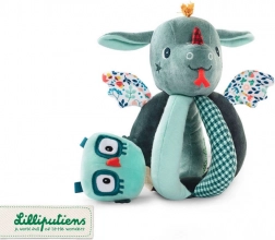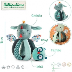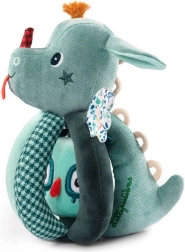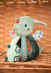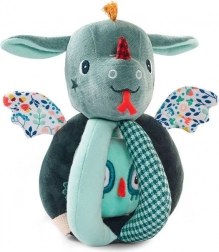 Seznamte se s dráčkem Joe – barevným parťákem pro první objevování. Tělo ve tvaru kuličky tvoří pět měkkých úchytů, jeden se šupinkami na zádech, křídla s různými materiály a odnímatelná sovička s ukrytou chrastítkem. V hlavičce je zvonivá chrastítka, další zvuky přidává šustící materiál. Hračka podporuje úchop, třesení, vkládání a vytahování, stimuluje zrak, sluch i hmat.