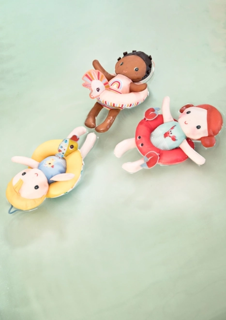 Panenka plave díky barevnému kruhu ve tvaru jednorožce a zve děti k veselým vodním dobrodružstvím ve vaně i bazénu.