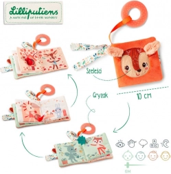 První měkká knížka pro miminka z kolekce Stella od značky Lilliputiens kombinuje jemný plyšový obal s roztomilou tváří srnky, šustícími stránkami, různými texturami a texturovaným kousátkem pro úlevu při prořezávání zoubků. Podporuje smyslový rozvoj, jemnou motoriku a fantazii, snadno se připne na kočárek díky poutku se suchým zipem a je ideální jako dárek pro miminka od 6 měsíců.